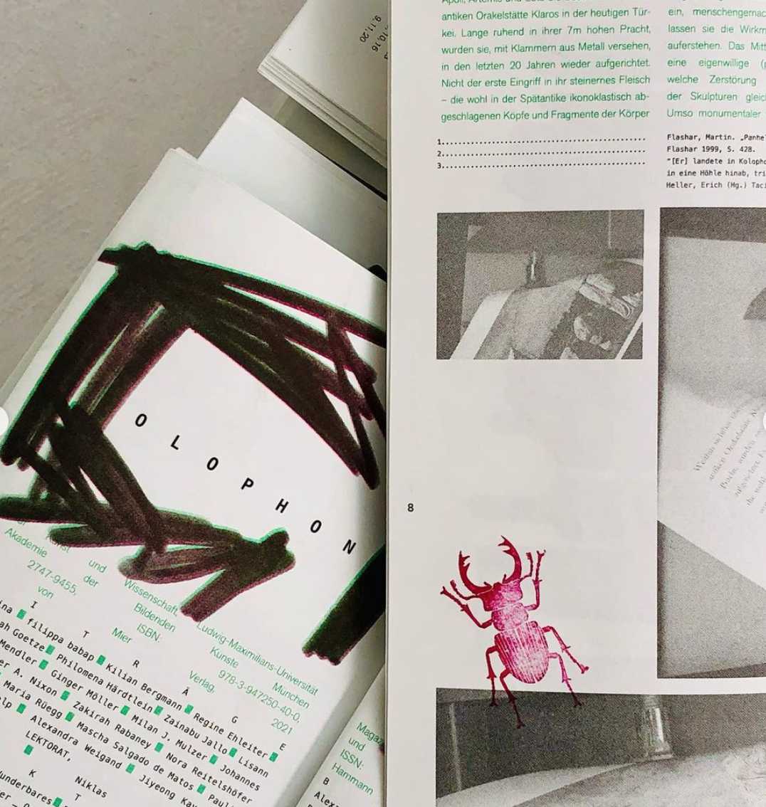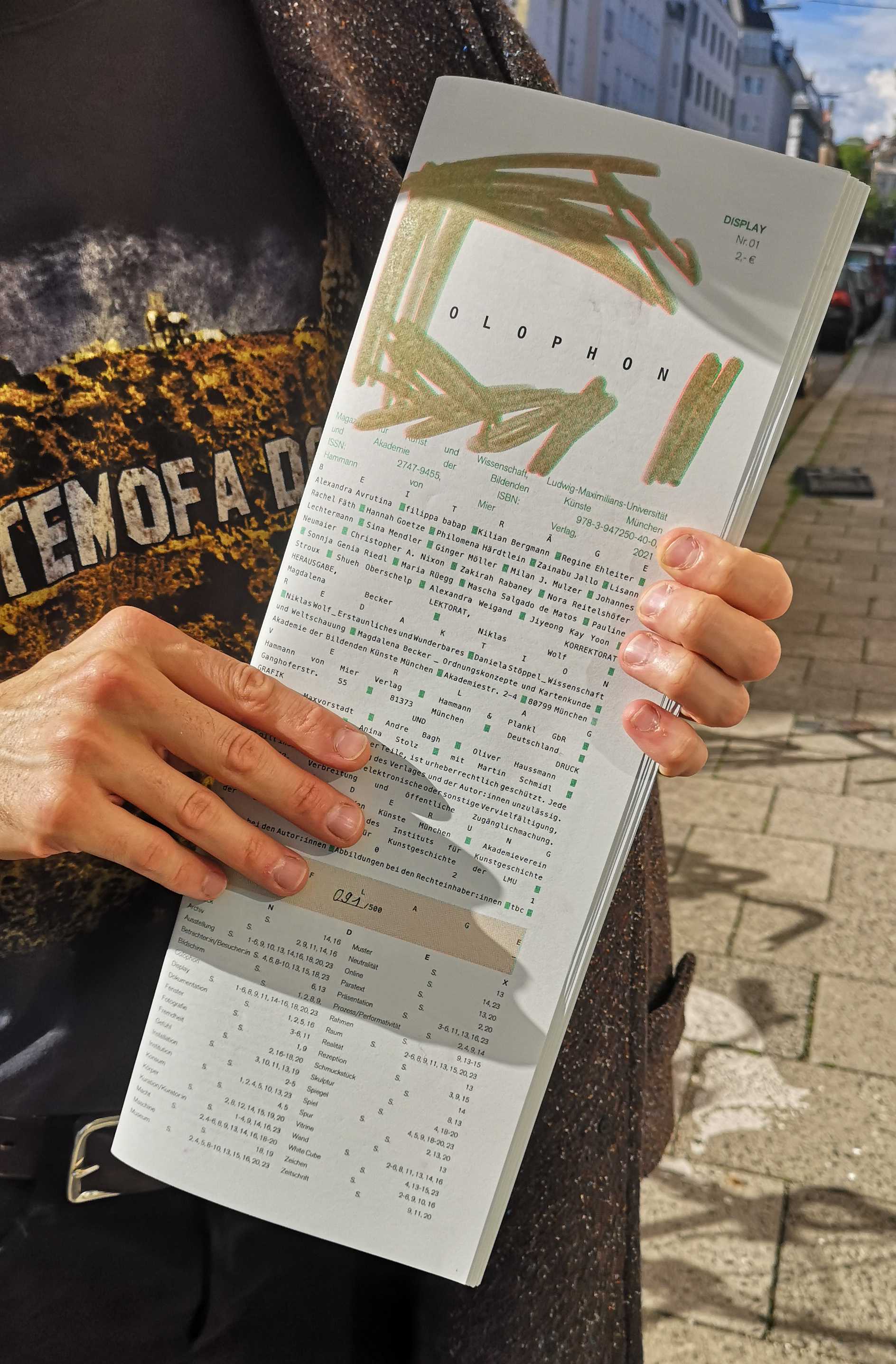 colophon - Magazin für Kunst und Wissenschaft is the outcome of a collaboration between the Institute of Art History of the University of Munich and the Academy of Fine Arts Munich. Within the framework of a cooperative seminar, students from both institutions developed its contents under the direction of Magdalena Becker and Niklas Wolf. Accompanied by contributions from various young academics and graphically designed by students of the print workshop of the Academy of Fine Arts, the first issue is dedicated to questions of display.