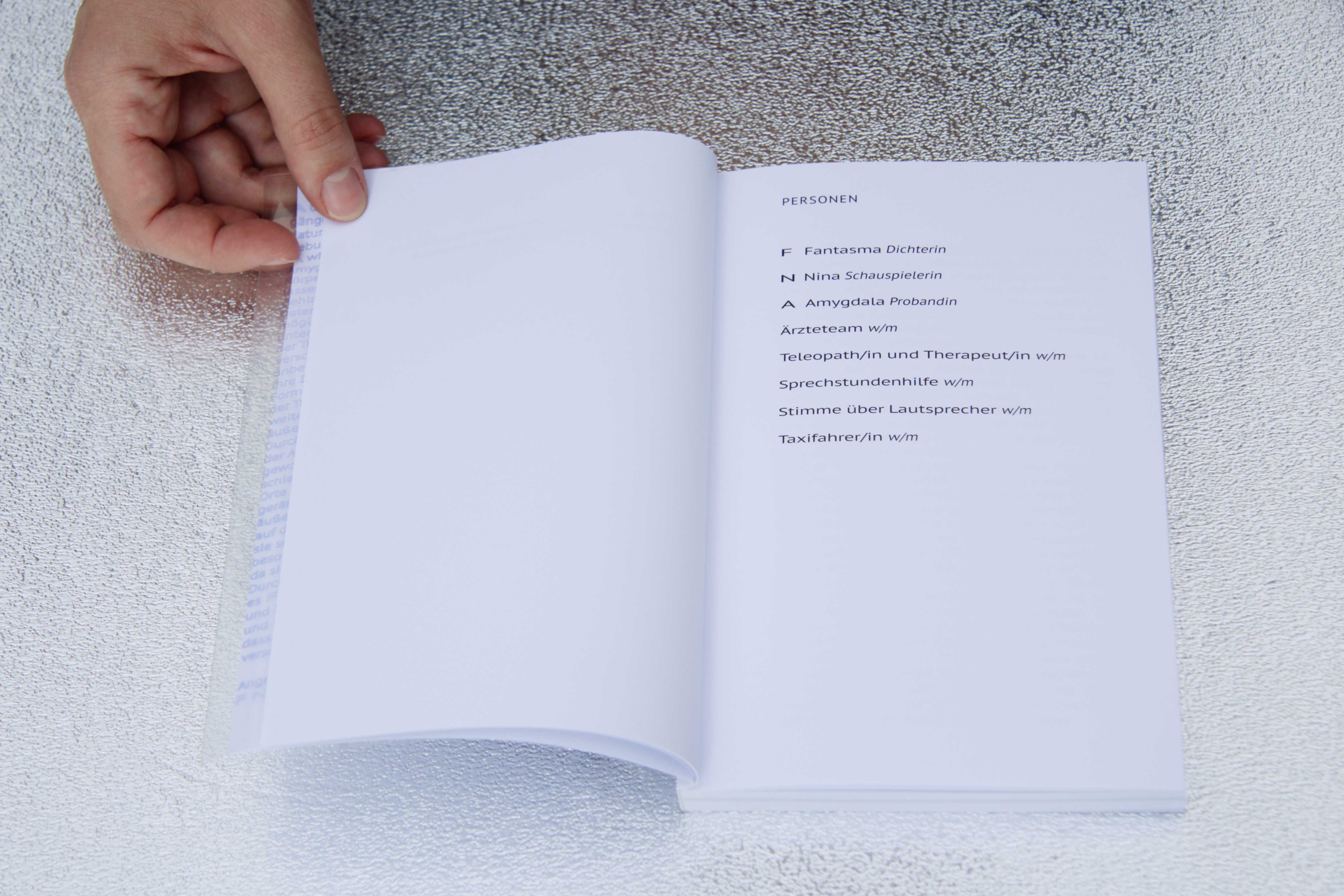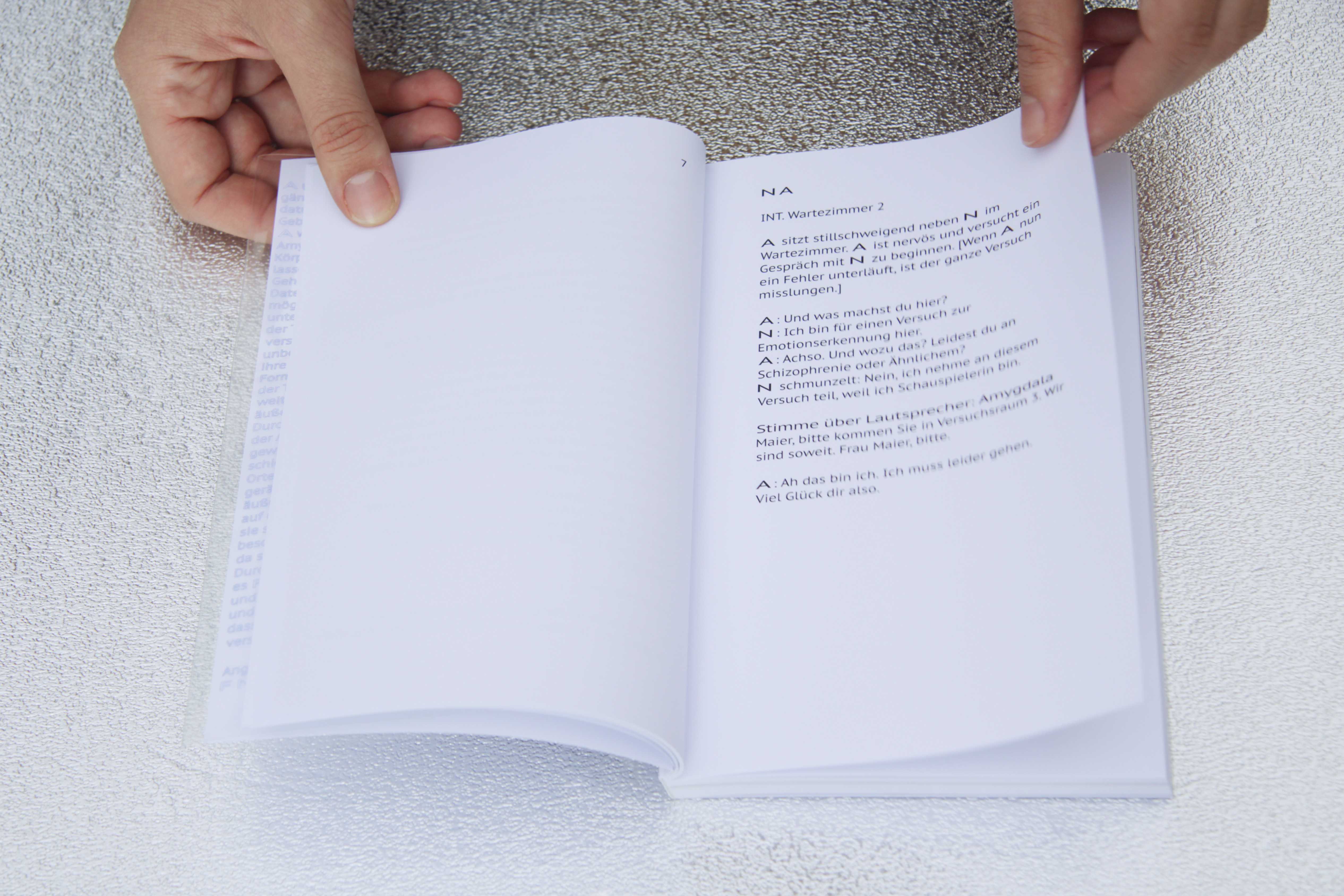 F, N, A are the three protagonists (Fantasma, Nina and Amygdala) of the artist book by Angela Stiegler, which throughout the script join up. Based on a true story this is a fiction, where identities become fluent, skin neither border nor permeable and affect provable, material and universal. Googlegangers, Triplegangers and Datadoppelgangers are no longer a cyber fantasy, but confront us with a phenomenon, that questions individuality and brings multiplicity into play.