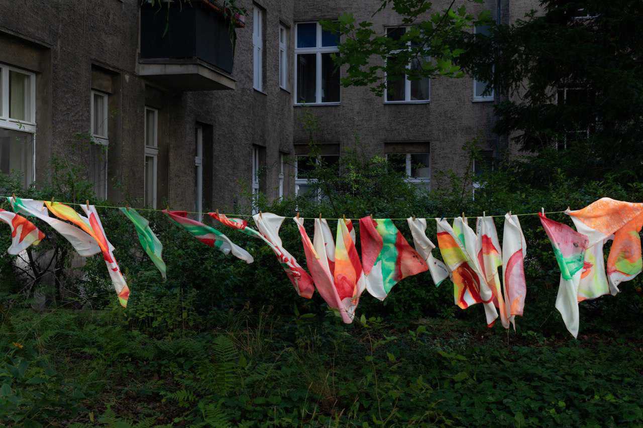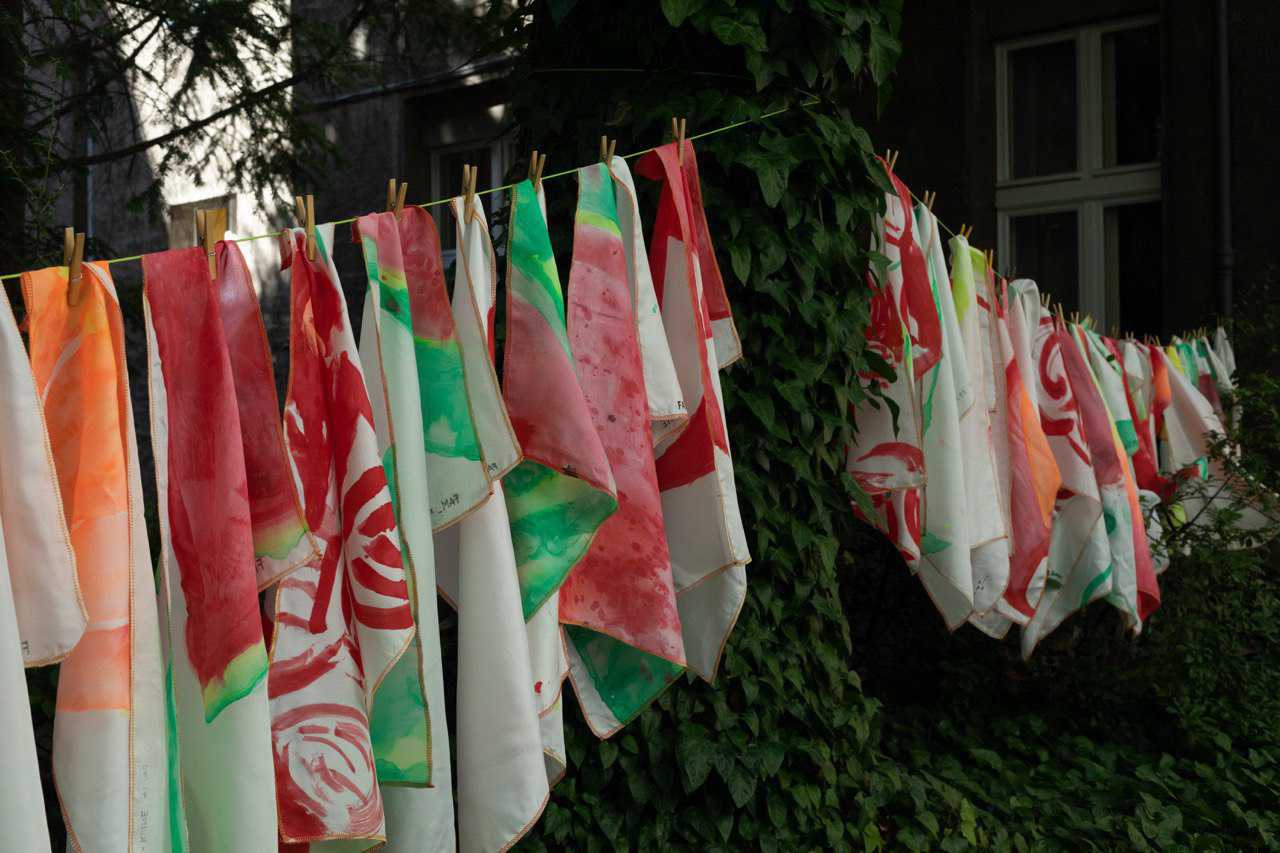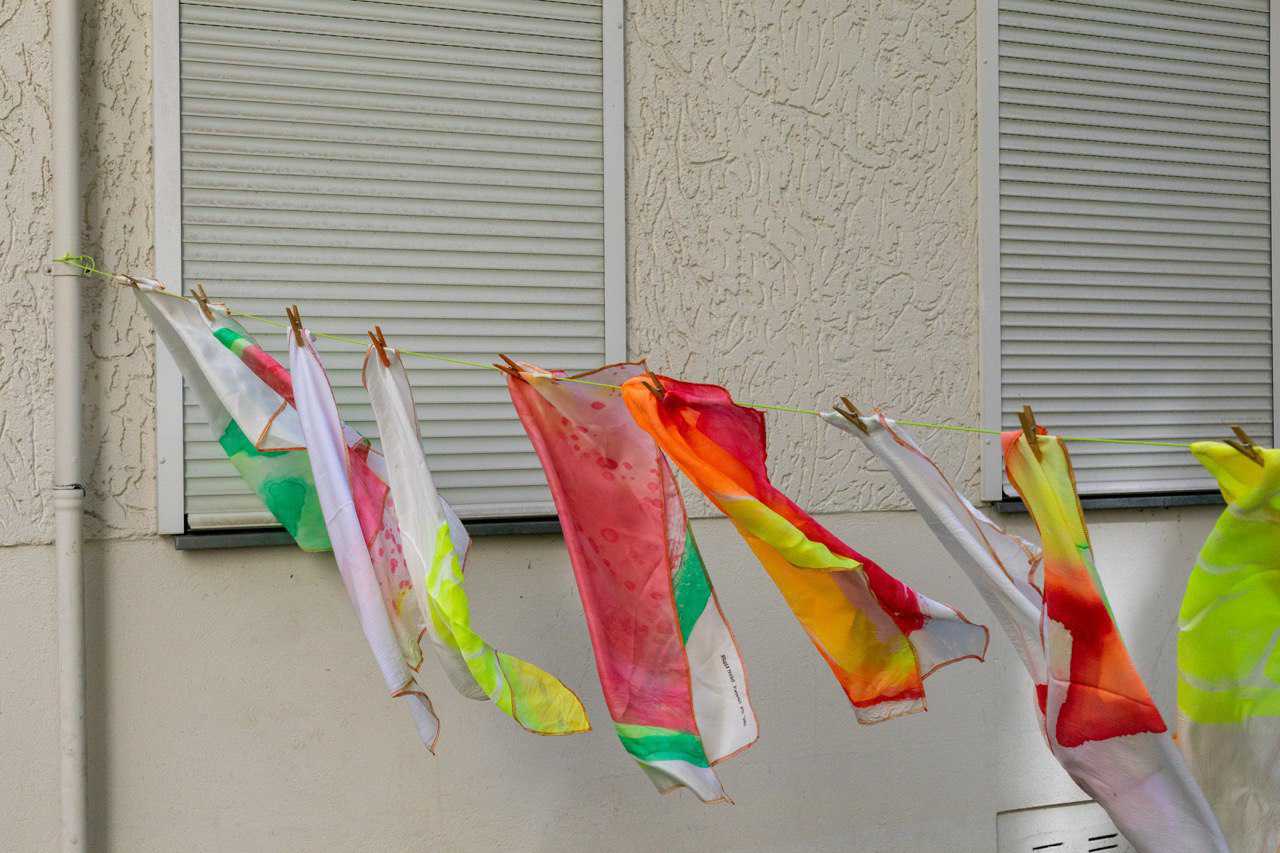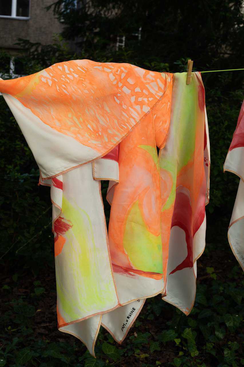 A huge banner, demanding the abolition of police, soaked in gleaming anti-teargas potion. Cut in 70 pieces, a part of the silky FAMily banner is now lying in your hands. It is: a mask, a headband, a handkerchief. A scarf, a hair ribbon to wave goodbye to the police (and all it stands for). It is a thread connecting temporary FAMily – in ruinous times. :~)