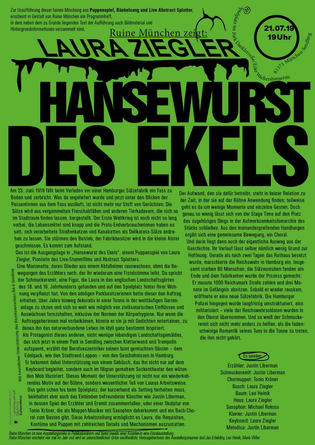 Publication includes the complete screenplay of Laura Ziegler's puppet show, presented as a performance with Ruine München in July 2019 in Munich.