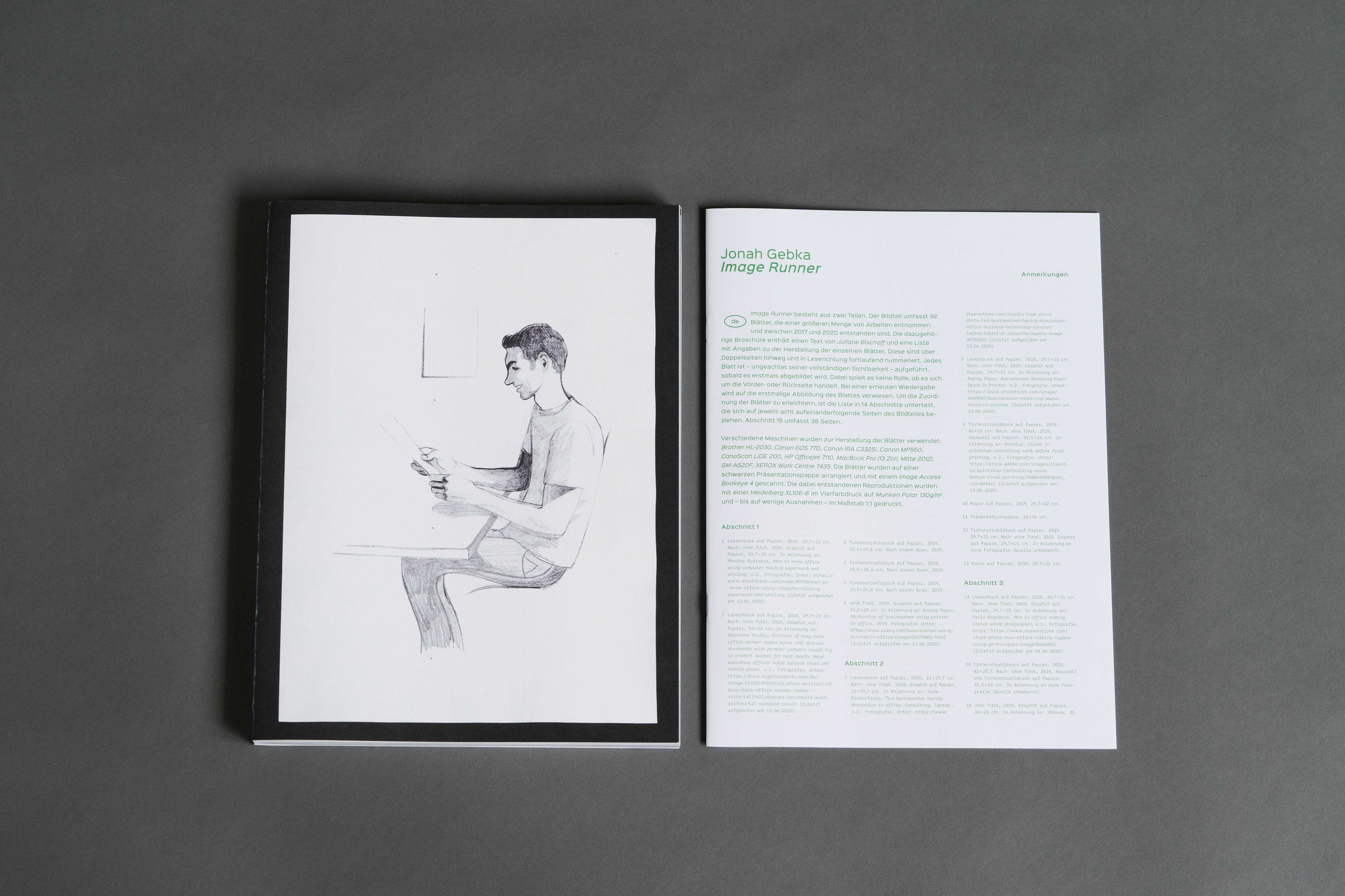 In his practice Jonah Gebka follows an interest in patterns and repetition. Through multiple references to his image archive, including stock images and other found material as well as his own drawings and photographs, he develops contextual strands bridging diverse visual material. Image Runner was published on the occasion of the exhibition Debutant*innen at Galerie der Künstler, Munich.