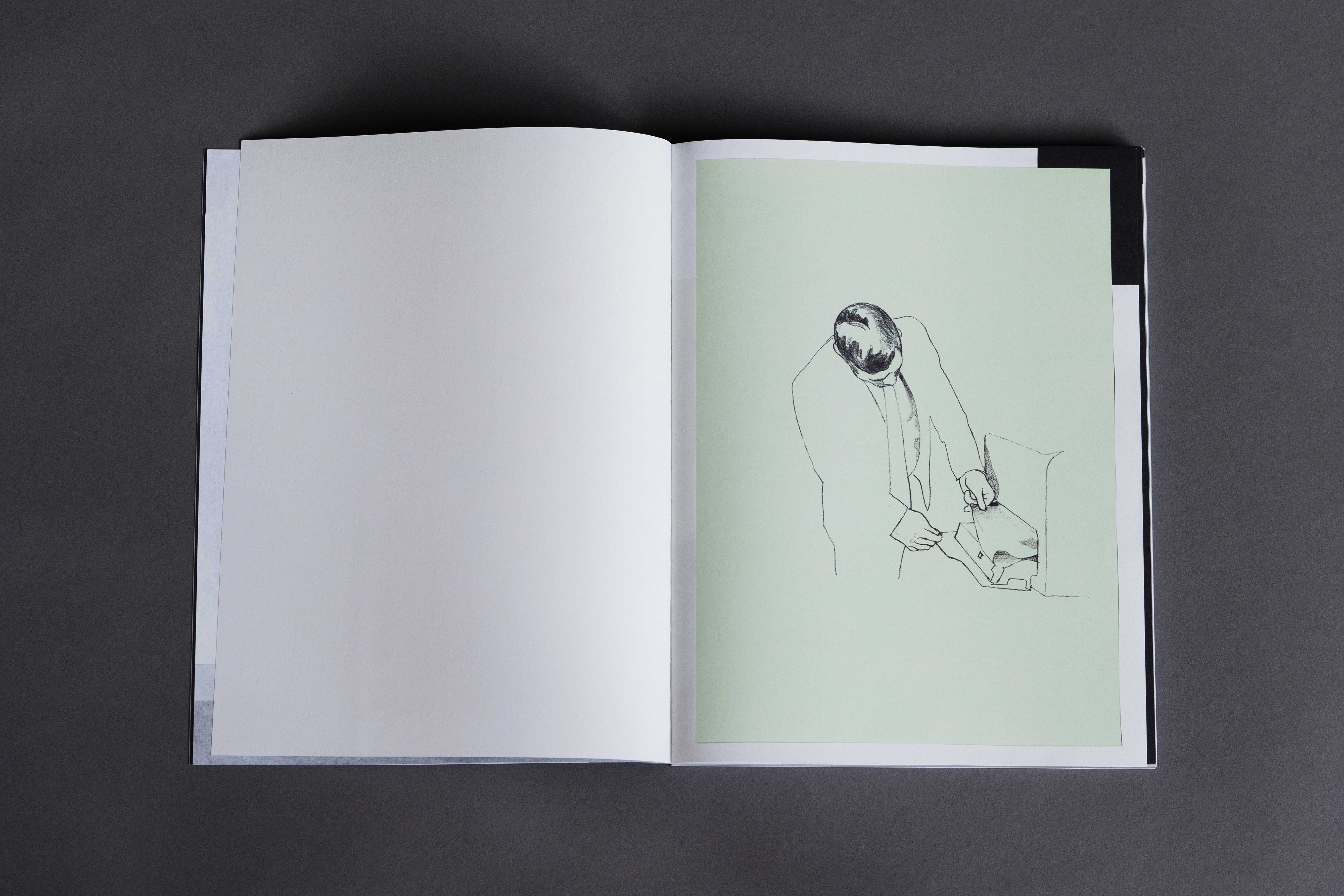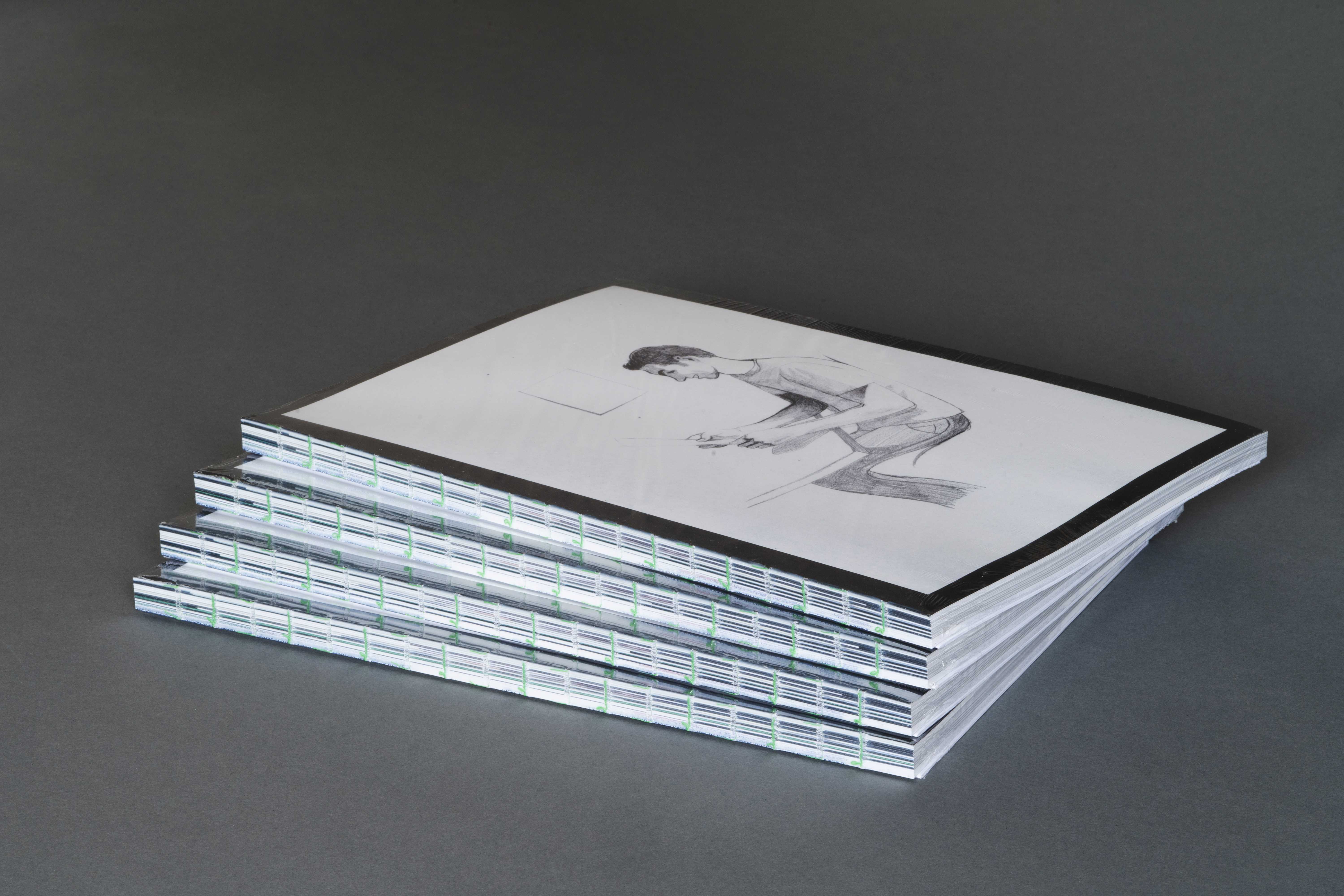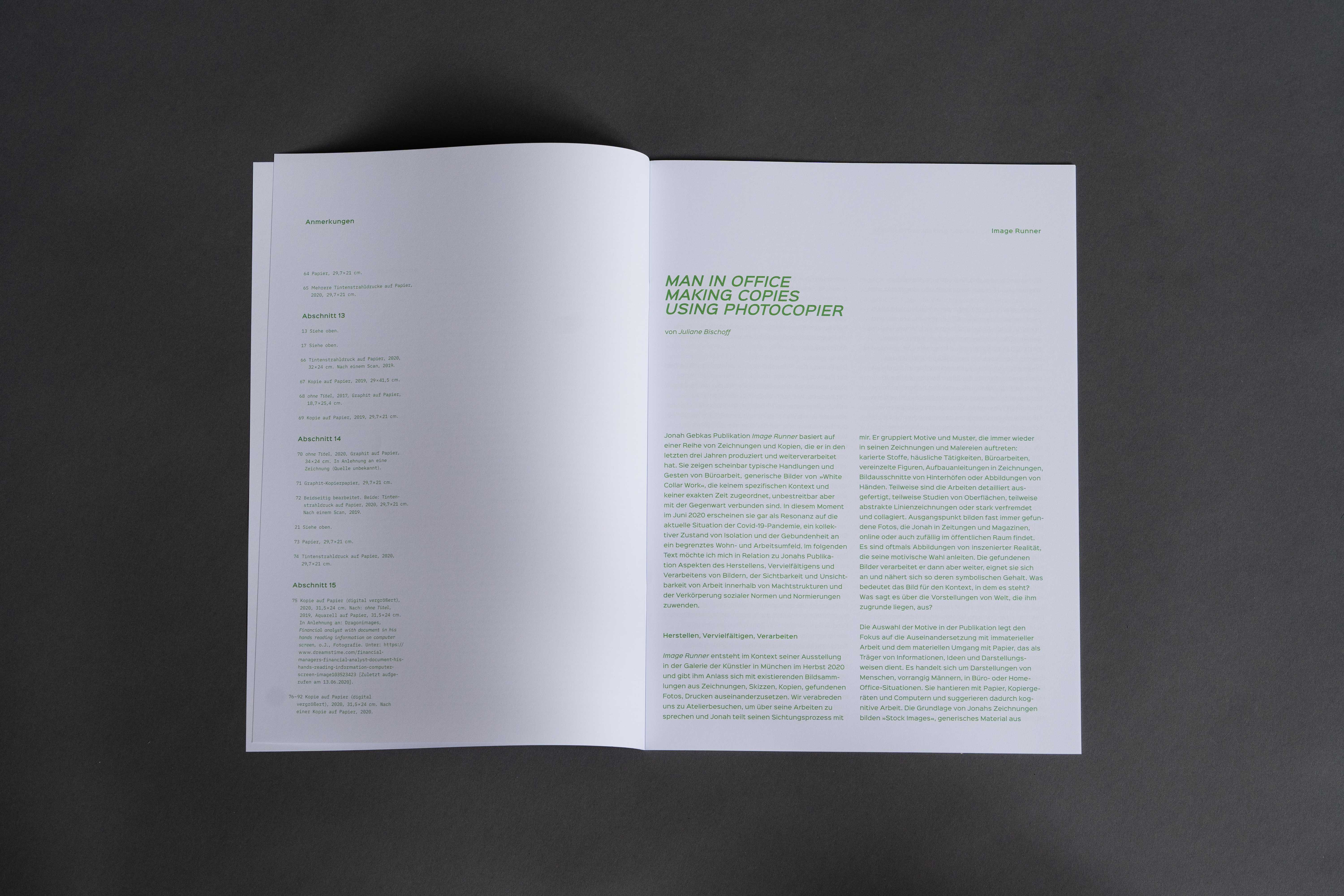 This artist’s book presents 92 sheets taken from a larger body of work on paper produced between 2017 and 2020. The accompanying brochure contains the text “Man in office making copies using photocopier” by Juliane Bischoff.
