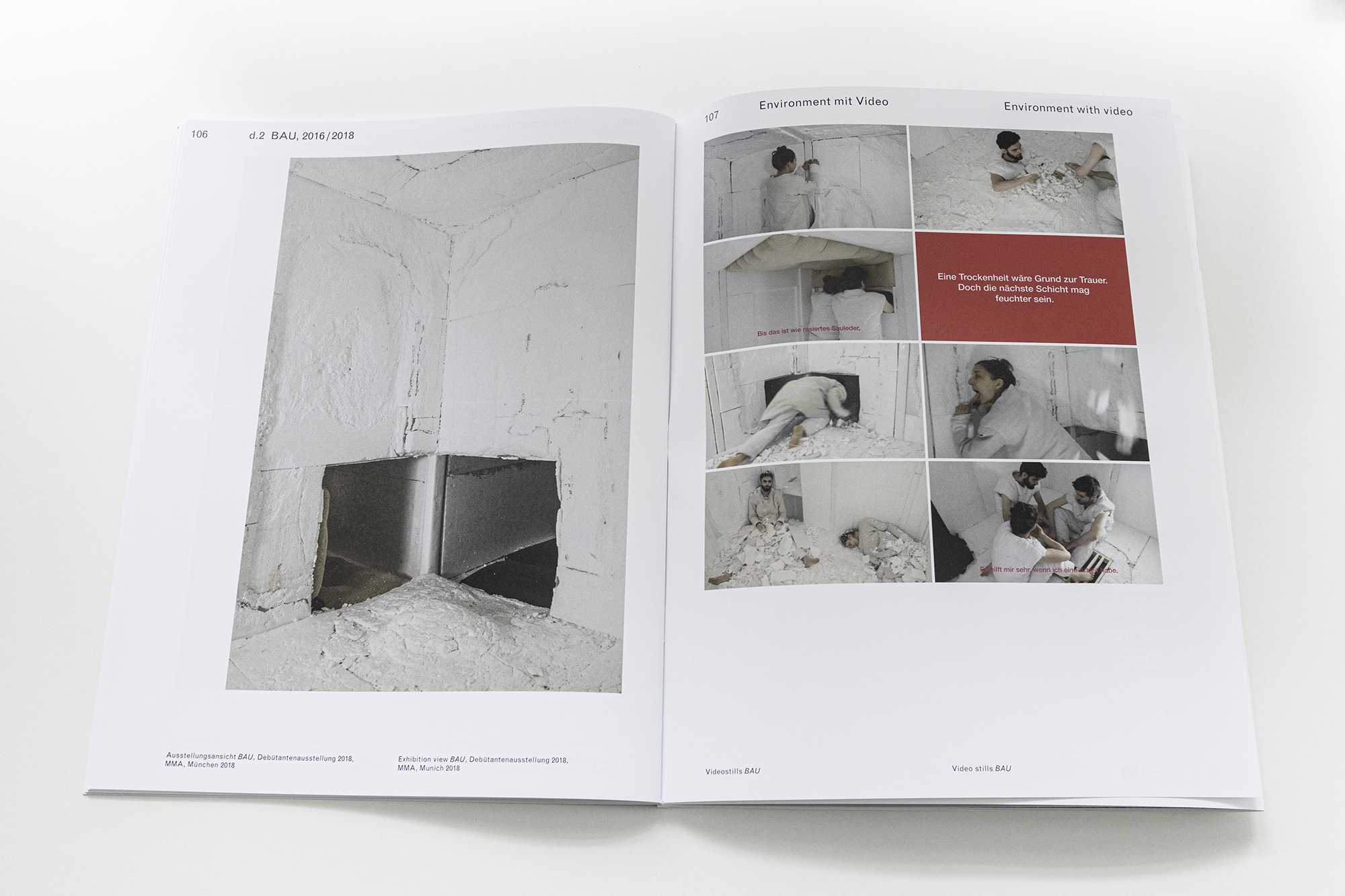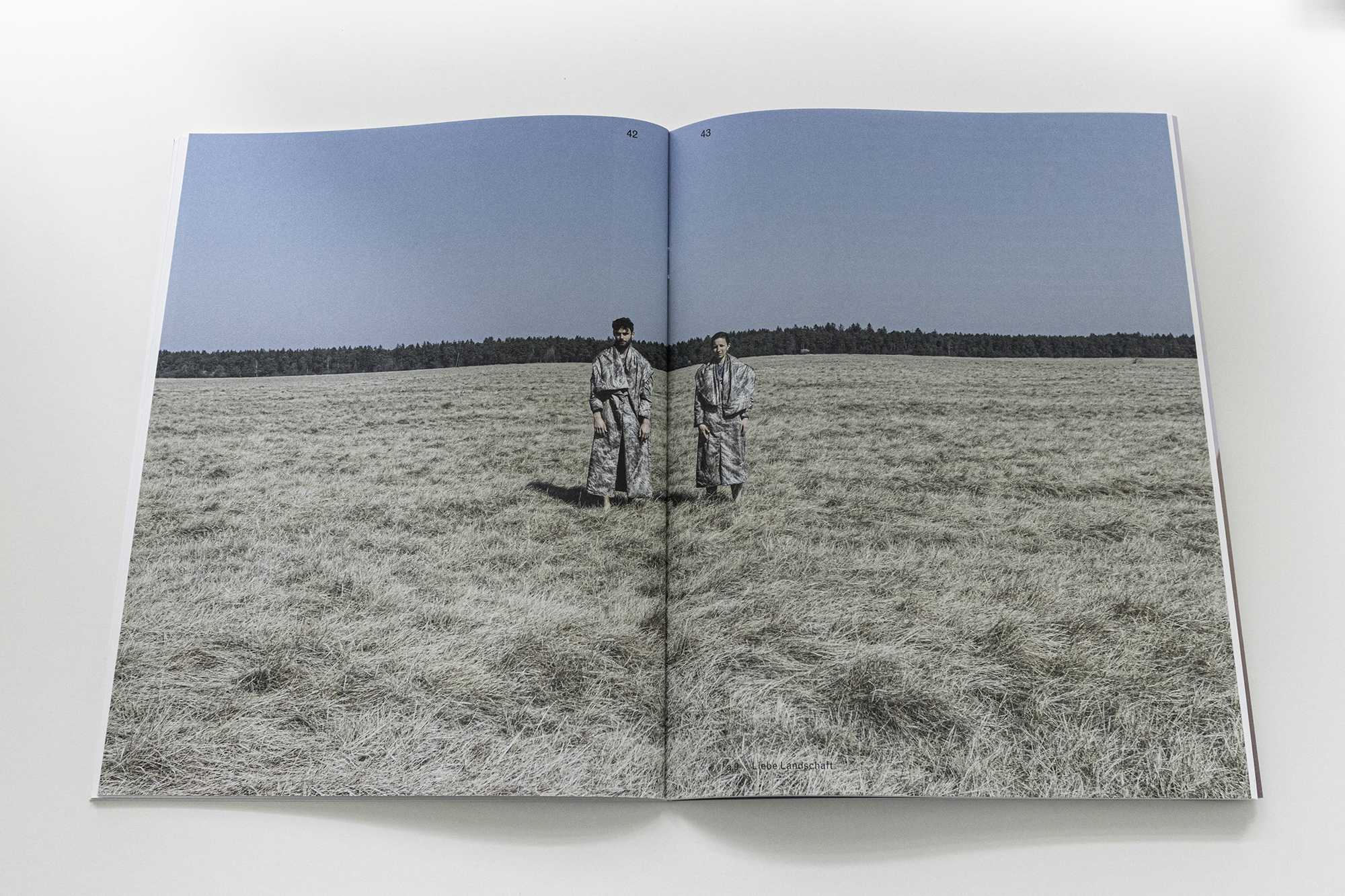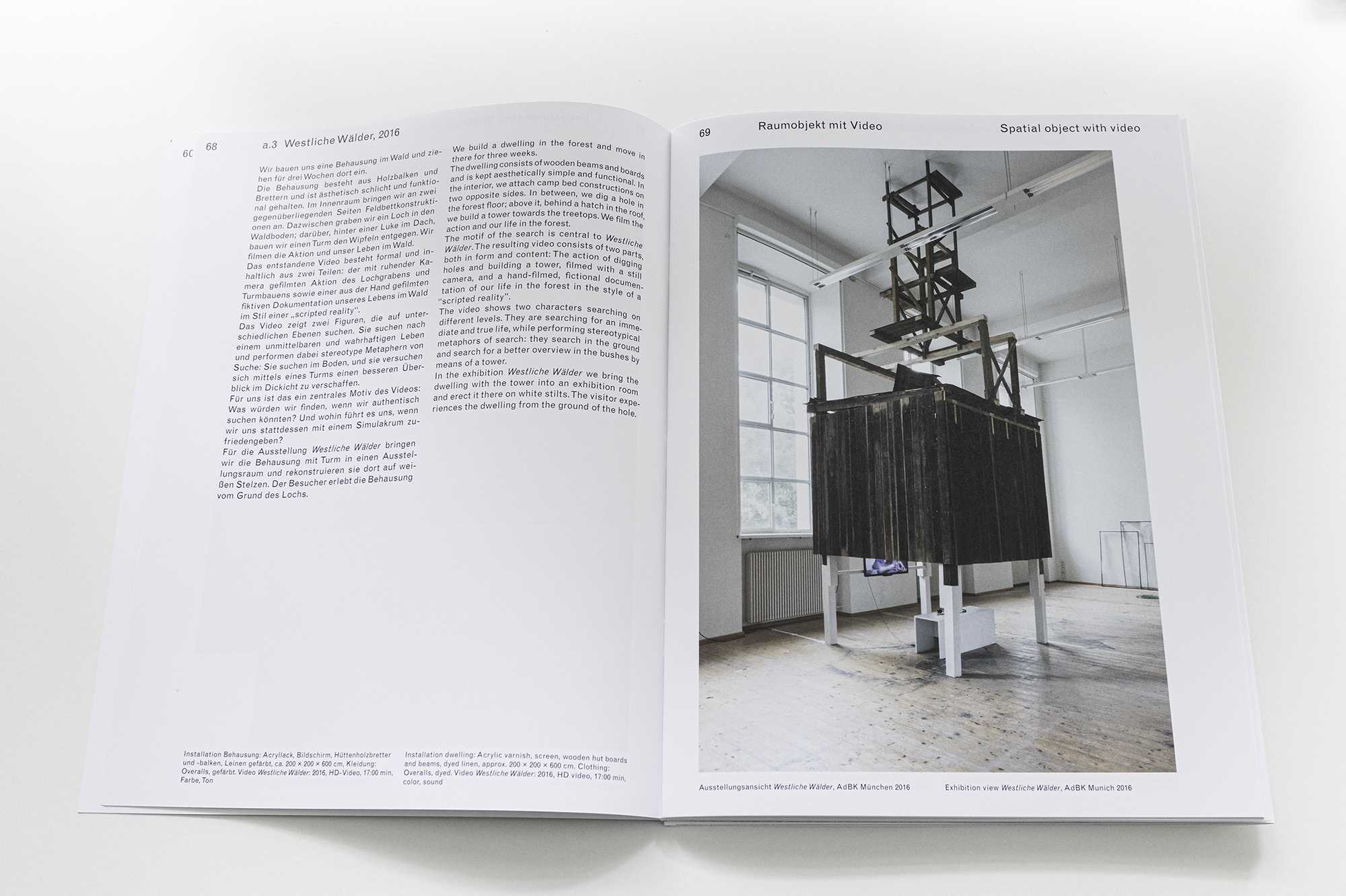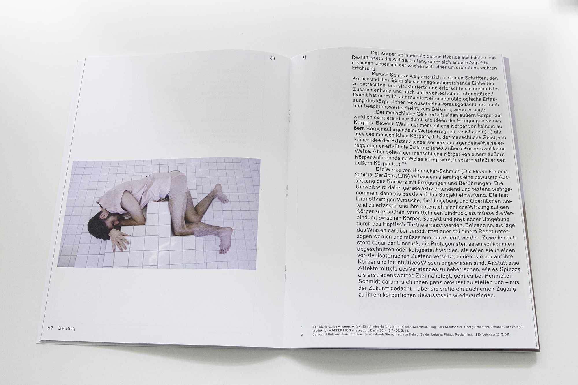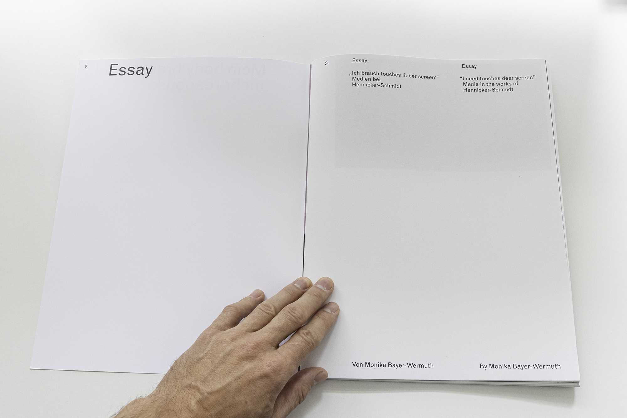 This publication consists of two sections linked by one folded cover: an essay by Monika Bayer-Wermuth, interspersed with illustrations of artistic works by the duo, and a more classically documented catalog part by Hennicker-Schmidt. Bayer-Wermuth discusses the contemporary body and its relationship to its surroundings in her text "Ich brauch touches lieber screen" – at the same time she examines the relationship between body and surroundings in the artistic practice of Melina Hennicker and Michael Schmidt. The catalog raisonné offers a chronological overview of the last five years. It contains exhibition views, video stills, song texts and information on the respective projects.
