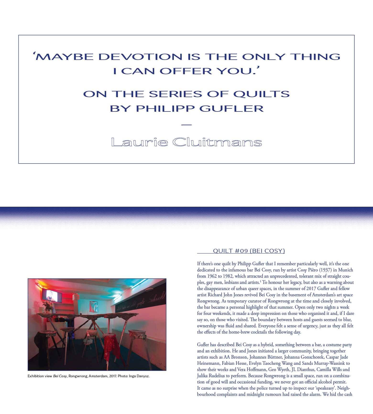 Quilt #01-#30 presents a series of quilts–silkscreen printed fabrics–(2013–ongoing), by Philipp Gufler. By combining text and image, Philipp Gufler's series of works refers to artists, writers, LGBTIQ+magazines and lost queer spaces, which are often omitted from the usual history books. The subjects that are central to Gufler’s quilts are closely related to his own artistic practice and interests, but also his personal life. The publication features an essay by Laurie Cluitmans, curator of contemporary art at the Centraal Museum.