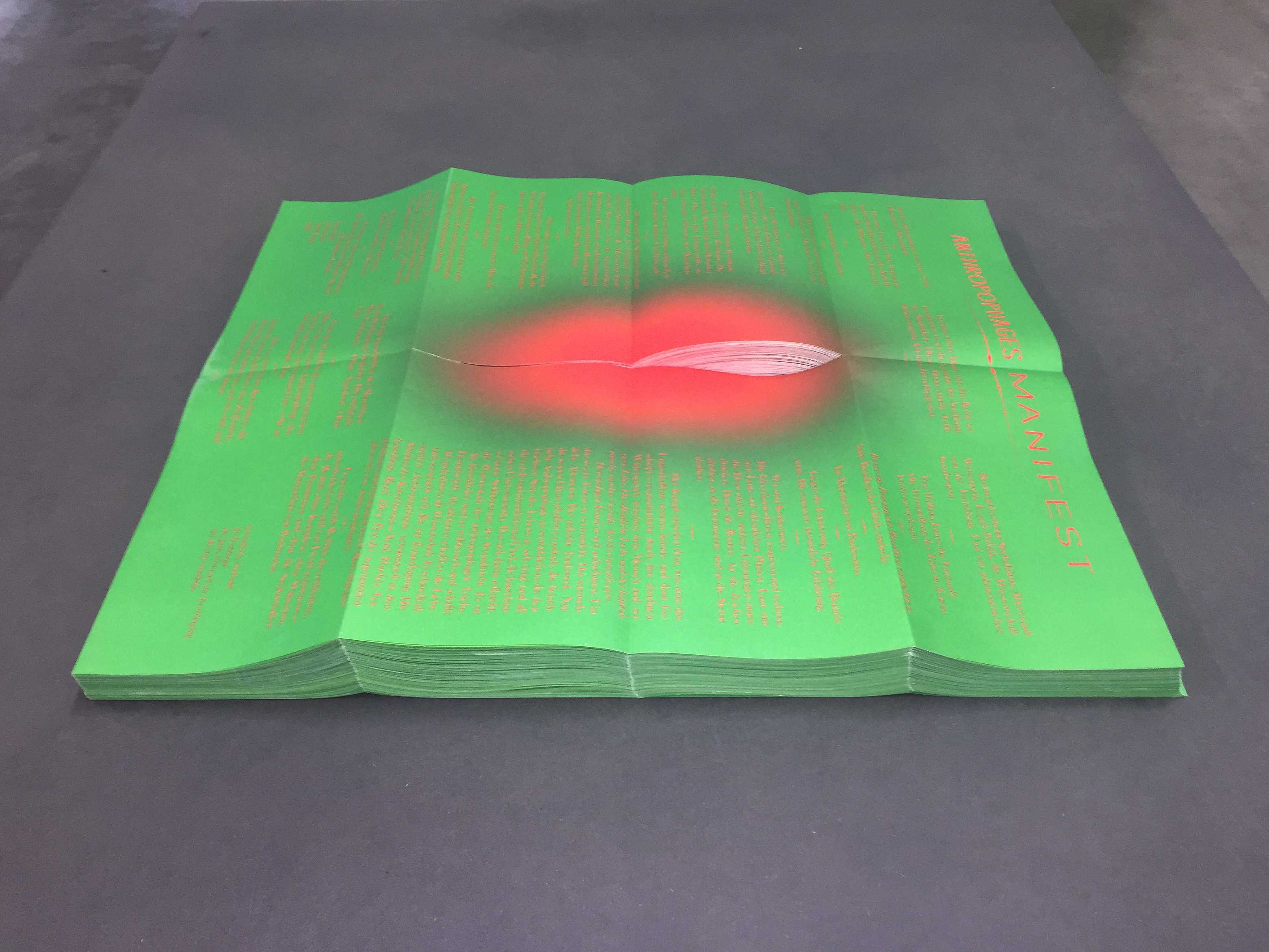 This poster/reader was made in collaboration with the philosopher and literary scientist Oliver Precht for the exhibition of young Brazilian artists "Frucht und Faulheit" (curated by Konstantin Lannert) at Lothringer 13, Munich. The poster contents Oswald de Andrade's Anthropophagian Manifesto, which has played a central role for the Brazilian modernity and is still an important point of reference for current art production. The manifesto is being complemented by contemporary Brazilian poetry as well as quotations by Glauber Rocha and Clarice Lispector. To reflect the opulence and eroticism of its content the stack of posters was set like an sculpture in the exhibition space.